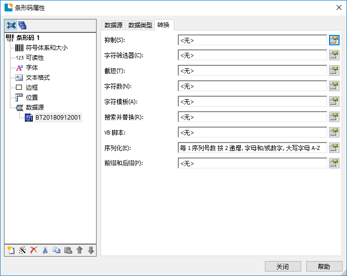 2. 在“條形碼屬性”對話框右側選擇“轉換”選項卡,單擊“序列化”右側的按鈕,進入“序列設置”對話框