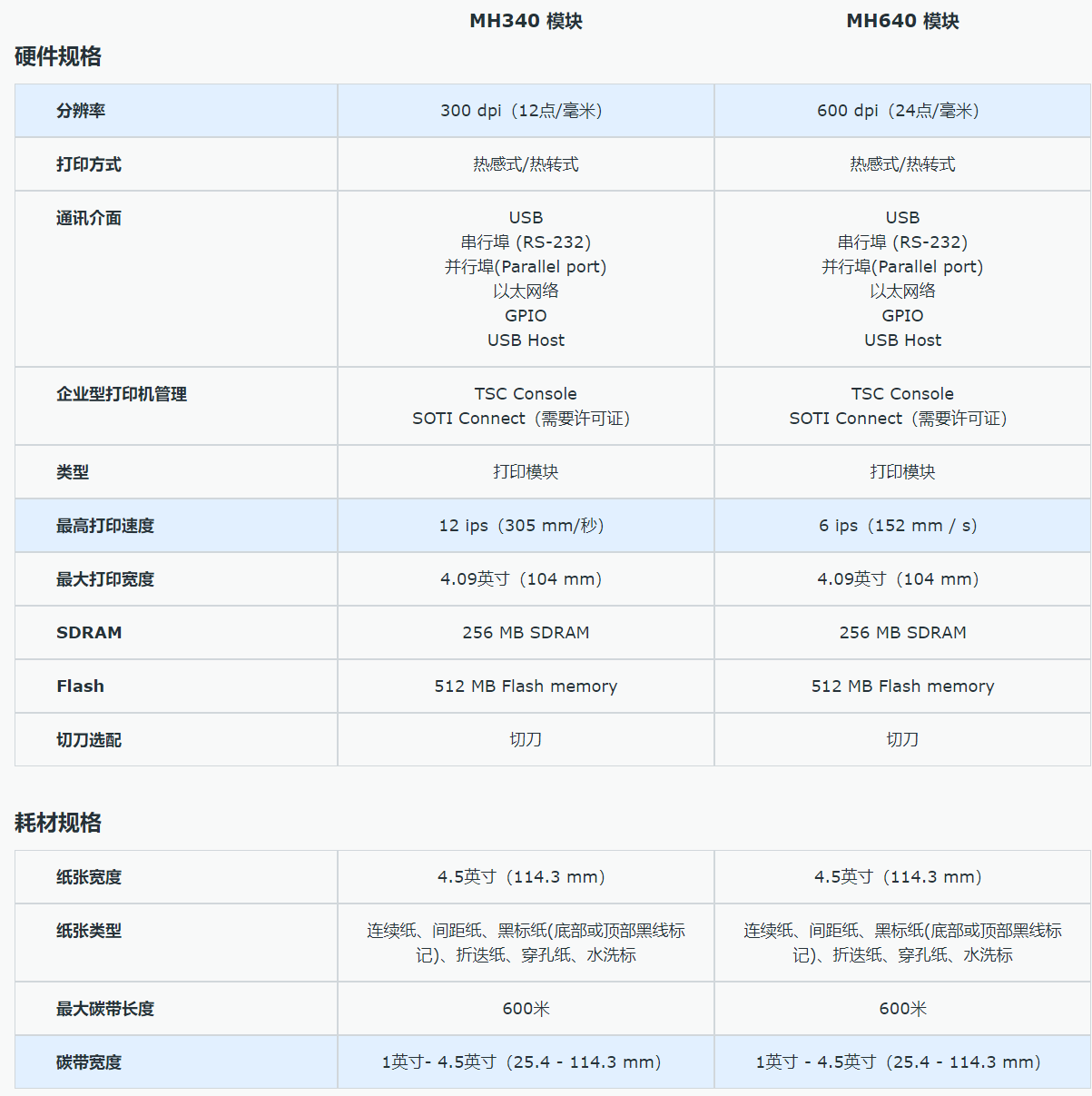 MH系列打印模塊配有大容量內存512 MB、256 MB SDRAM,通訊接口包含USB、串行端口、內建式以太網絡服務器,碳帶容量達600公尺。選配包含標簽剝離模塊(含底紙回收器)、GPIO和切刀,其中小標簽剝離能力達到0.5寸長。