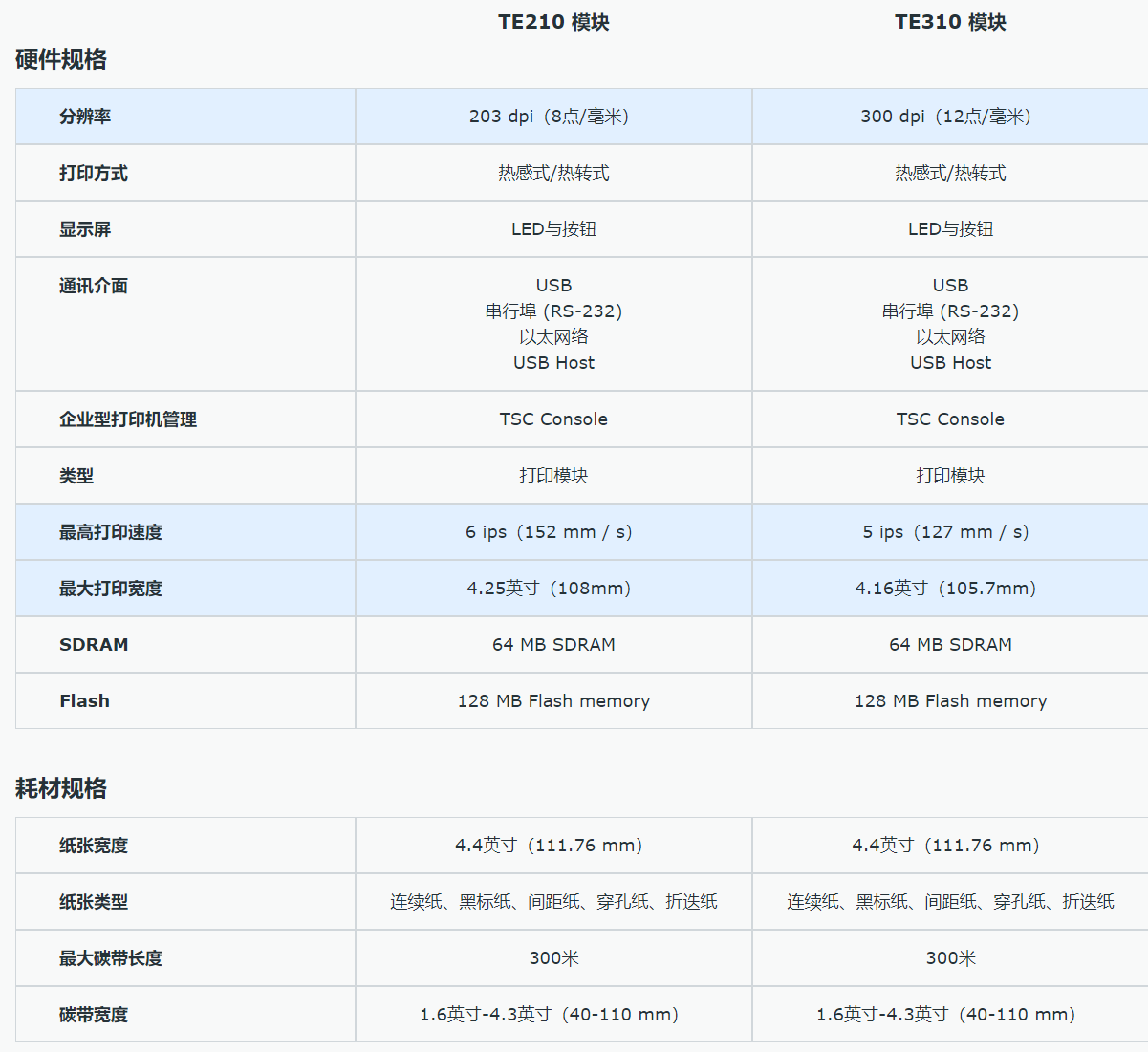 TE系列打印模塊經由ABS塑料貝殼式掀蓋設計,能夠承受嚴苛環境。搭載128 MB Flash、64 MB SDRMA內存、配有USB、串行端口(RS232)、以太網絡與USB Host。支持0.5寸管芯,碳帶容量可達110公尺,或是1寸管芯,可容納300公尺碳帶,方便客戶挑選不同的耗材。