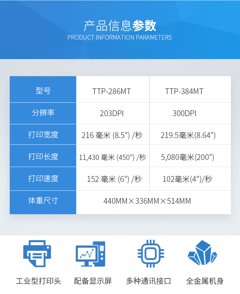 ?TTP-286MTTTP-384MT打印規格解析度8 點/毫米 (203 DPI)12點/毫米(300DPI)最大列印速度152 毫米 (6") /秒102毫米(4")/秒最大列印寬度216 毫米 (8.5") /秒219.5毫米(8.64")最大列印長度11,430 毫米 (450") /秒5,080毫米(200")列印模式熱轉式 / 熱感式熱感式/熱轉式LCD/LEDLCD/LED16 bits 彩色屏幕,顯示屏 480 × 272 畫素及背光顯示,觸控面板16bits彩色屏幕,顯示屏480×272畫素及背光顯示,觸控面板記憶體SDRAM256 MB256