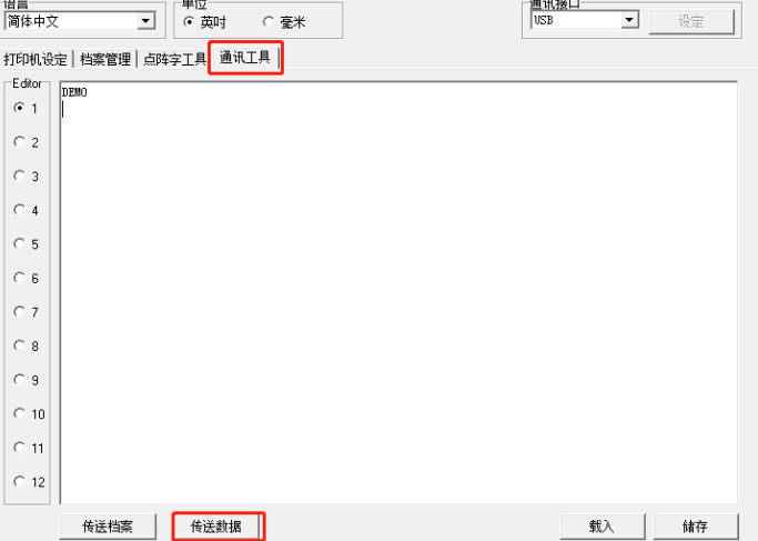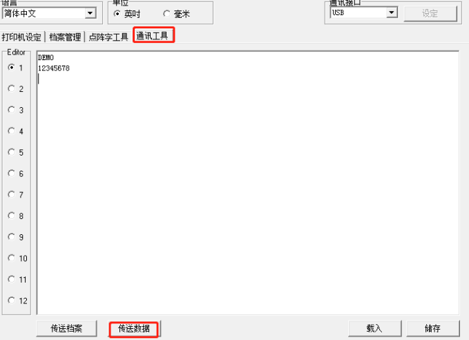 b.有變量時,輸入檔案名回車,再輸入對應的變量數據回車,點擊“傳送數據”按 鈕即可打印對應模板。